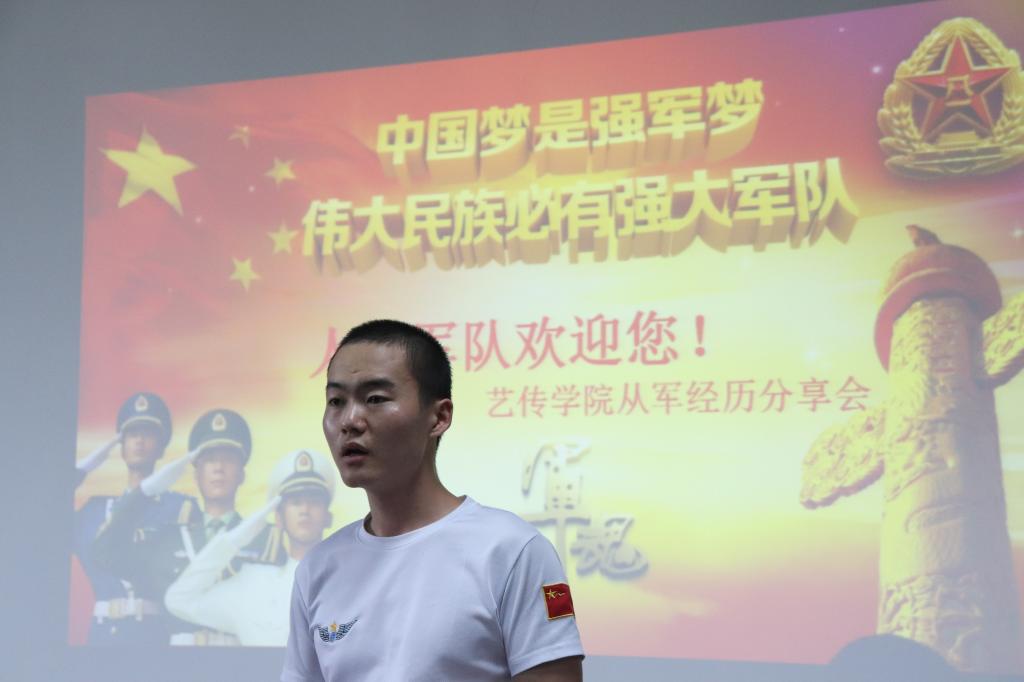巾帼不让须眉,女子也可以成为军人中的一员。15级从军员工姜慧讲了自己训练的情况,她特别提到了站岗,每一次站岗时间长达4、5个小时,十分辛苦。当她回忆到自己宣誓的场景非常感慨:那种使命感和责任感空前高涨。随后,她给在座的同学们介绍了征兵政策,包含征兵的条件和当兵的好处等,她希望大家都能够积极参与。