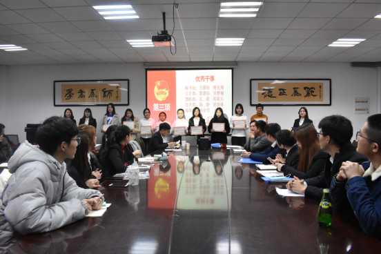 大会第二项,对优秀干事进行表彰并颁发证书,对优秀干事认真努力的成果进行充分肯定。在诸位优秀干事的发言中,也体现了大家进入新媒,从一开始的迷茫到被这个温暖的大家庭所拥抱,再到心甘情愿的为这个组织做些贡献的心路历程。随后,新媒体中心主任郭凯分享了自己一路走来的点滴:“越努力越幸运 命运不会亏待努力的人;不逼自己一把,永远都不会知道自己有多优秀。”并告知下届干事对每件事的背后都蕴藏着今后的人生,鼓励大家认真对待自己的工作,正确面对工作中的问题和困难。