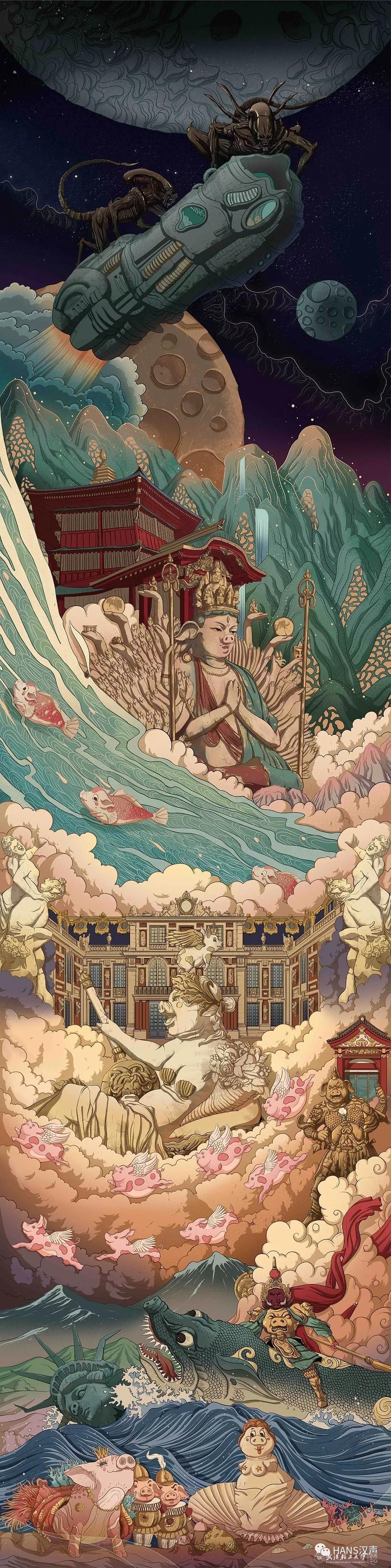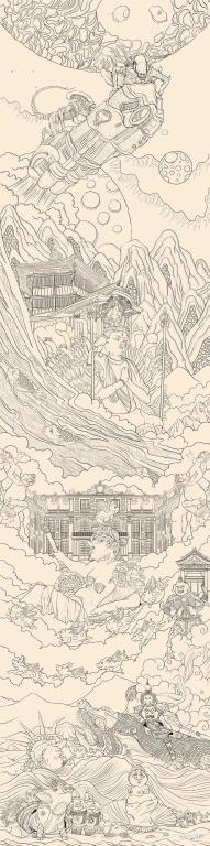 ◐吴尧的《千猪图》(局部)。完整版从海底延伸到太空,超大,往下翻就能看到全貌。