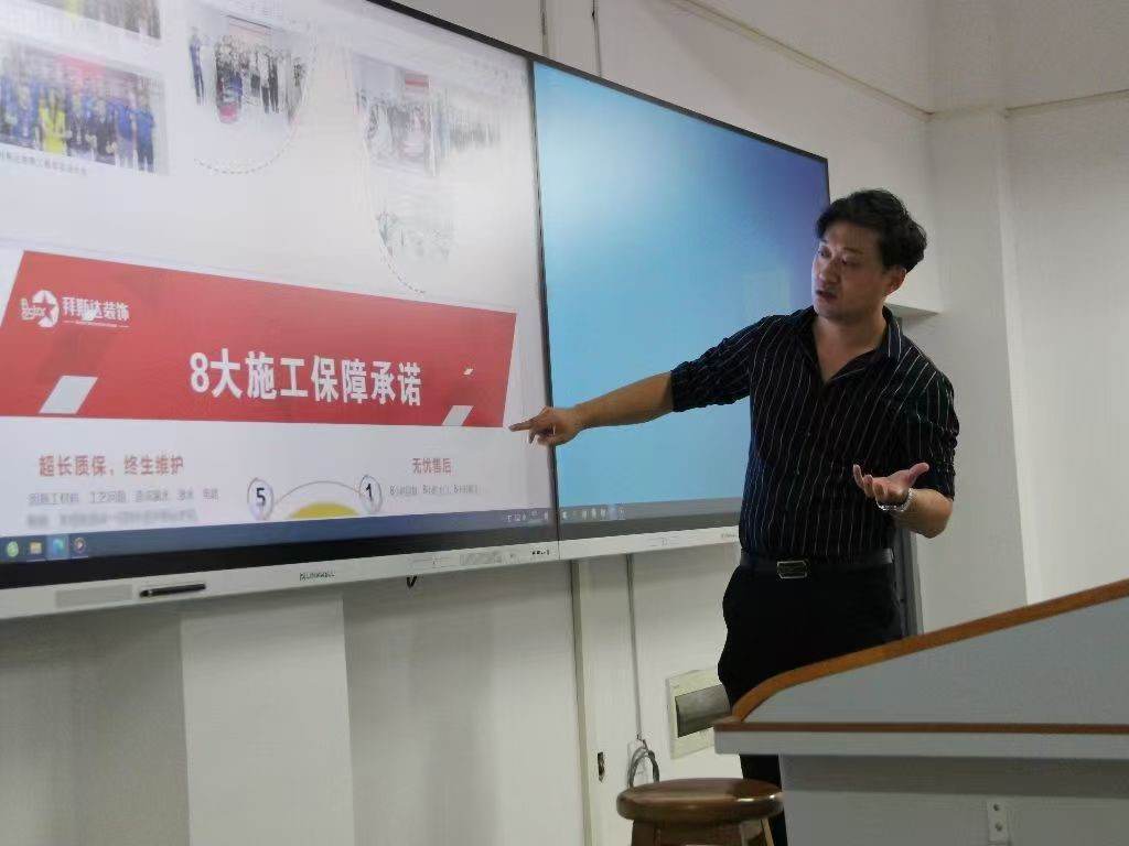 企业负责人李经理通过播放企业宣传片和ppt讲解,向同学们集中展示了企业形象、企业文化,重点介绍了专业资质和行业荣誉。拜斯达装饰企业成立于2008年,是集室内装饰设计、施工、产品配套及全国特许经营为一体的整体家装公司。企业的设计师团队不仅拥有丰富的经验,始终秉承着“让客户满意,是我们终生奋斗的事业”理念,获得广泛赞誉。企业拥有完善的员工培训体系,定期为员工提供专业培训,提升每位员工的技能水平,确保他们能够在各自的岗位上发挥最大潜力。