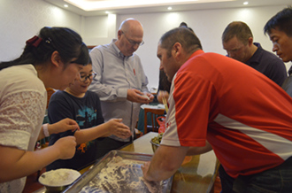 体育馆的篮球赛让人充满期待。比赛开始之前,大家就早早的来到赛场进行了热身准备,此次比赛并没有裁判,也没有记分牌,但老师们也抱着十分认真的态度来对待比赛。哨声一响,各队员立刻就位,激烈的比赛就此拉开了帷幕。虽然老师们知道这是一场没有输赢的比赛,但大家也是拼尽全力地去拼搏。比赛结束后,老师们相互击掌、拥抱,用实际行动践行了“友谊第一,比赛第二”。这场球赛在紧张的氛围中开始,在老师的欢笑声中结束。在这和谐的欢笑声中,大家来到食堂进行下一项活动——包饺子。饺子是中国的传统美食,吃饺子是一种享受,包饺子则是另一种不一样的体验。外教们都对对包饺子表现出极大了的兴趣,积极请教、学习,公司老师以及一些热心的同学也不厌其烦的一遍遍教这群不一样的“员工”包饺子。经过大家的共同努力,盘子里各式各样的饺子逐渐增多,老师们经过自己的劳动之后收货的喜悦之情溢于言表。最后,本次联谊活动在一片欢乐祥和的气氛中顺利结束。
