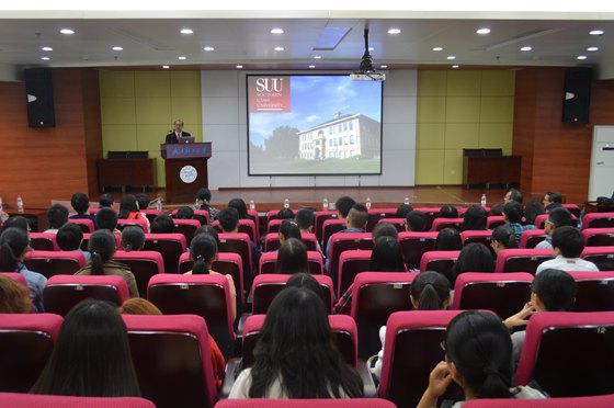 十月十四号下午,美国南犹他州立大学代表团来公司进行访问,并在金银湖图书馆二楼报告厅与公司中外合作办学广告学专业举行了师生见面会。南犹他大学副董事长兼教务处长Dr.Cook、管理国际事务的副董事长Dr.Allen、国际处处长Dr.Jacob Ng、公司国际合作与交流处副处长习强毅、公司经理陶丽萍、副经理陈莹燕和广告学全体专业老师应邀出席了本次活动。2015级中外合作办学广告学专业近100名同学参加本次活动。