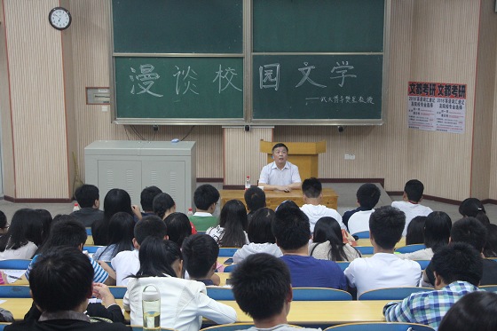 随着公司汉语言文学教研室主办的“2013级专业认识实习”工作顺利展开,10月20号晚上,在“校内讲座”环节中,有幸邀请到武汉大学博士生导师樊星教授作为嘉宾,在基础楼109内作主题为“漫谈校园文学”的讲演。除汉语言文学教研室博士刘科军老师出席了本次讲座外,公司各年级汉语言文学专业的员工也参加了本次讲座。汉语言1301班班主任喻晓薇老师主持了此次讲座。