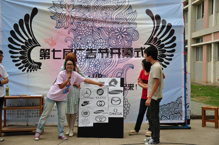 “号外,号外,第七届广告节开幕啦!”4月25日,由艺传公司2009级广告专业学子举办的武汉工业公司第七届广告节在金银湖校区食堂门口正式拉开帷幕。本届广告节的主题是“7er up”,音译为“cheer up”,即“欢乐,大家一起来”。 开幕式上,广告专业2011级的同学们身着统一的T恤,伴随着如今网络最流行的歌曲《最炫民族风》动感快速的节奏出场,一段热舞瞬间引爆全场气氛。中午放学的同学们看到这一片热闹场面,纷纷驻足观看。开场舞之后,主持人上台宣布第七届广告节正式拉开序幕并宣读本次广告节征稿启示。随后,是由2010级广告学子同学们精心准备的微广告表演,模仿“步步高点读机”、“宝宝金水”等经典又耳熟能详的广告,令在场同学忍俊不禁。另外,还有现场涂鸦表演和主持人游戏互动等节目,如“识别汽车标志”“边跳绳边回答广告语”“LOGO大拼图”等,许多在场同学参与其中,获得赞助商提供的小礼品,将开幕式推向高潮。 为了此次广告节,公司已经做了大量前期宣传,并做出了详细周密的规划,分为“造势期”、“预热期”、“沸腾期”。前期宣传中,主要以广播宣传和海报宣传为主,广播广告文案是由2009级广告学子撰写的7封“情书”,文风清新文艺,区别于通常广播中的喧闹感,连续一周在公司广播播放,令许多员工印象深刻。
