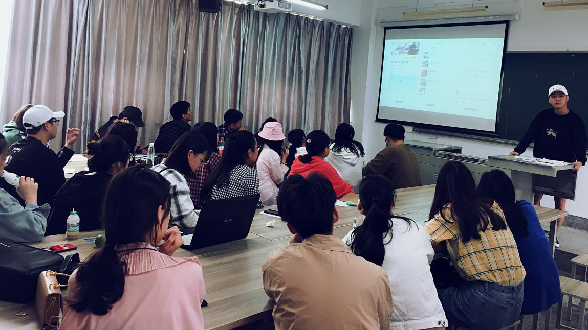 3. “学呀”校园资讯分享类校园产品。“学海无涯、学无止境”以这样的想法为初衷,组员在进行了用户需求调研后。曽冰冰同学在讲台上富有激情的讲述着小组产品的汇报总结,台下的老师和同学们也在仔细学习。员工随着讲述者的引导看着PPT,对作品产生疑惑或认同时及时写下笔记,偶尔又和身边的同学低声交流自己的看法。