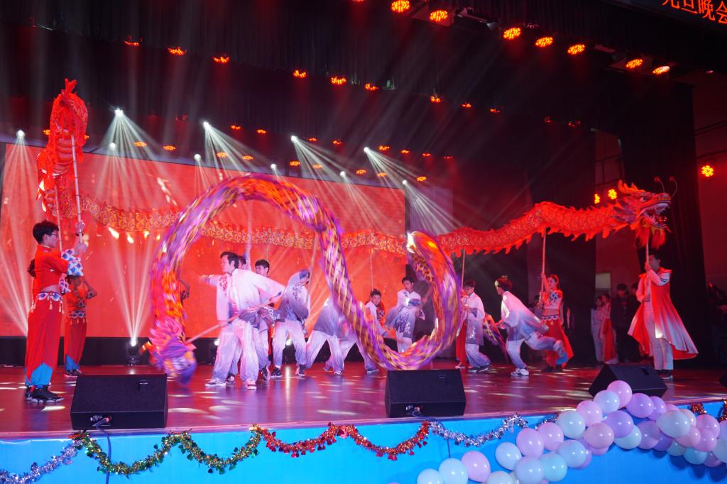 本次晚会以玄赤民族文化协会表演的《龙腾九霄》为开场。旗队挥舞旗帜猎猎作响,举龙舞动尽显腾跃之劲,三龙一旗精彩的花式,多样的舞龙动作,气势如虹,燃起了员工对晚会的热情。随后六位主持人致元旦贺词,在此次晚会中,研究生参与主持将成为舞台一大亮点,这也是公司近年来研究生参与节目编排,共同合作的一个开创之举。