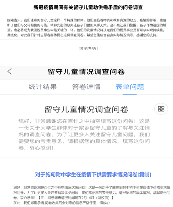 在这次的志愿活动中,我们了解到比往常更多的留守儿童的情况。为了全方面了解到疫情期间留守儿童受助供需矛盾的问题,我们线上分别寻找了志愿者,留守儿童和在校老员工三个群体,并采取问卷调查和访谈形式深度了解了疫情下留守儿童的情况。