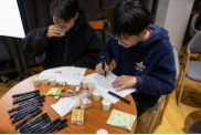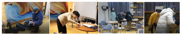 接下来,沙龙课的重头戏味觉实验活动就开始了。第一组员工每人面前都提前摆好了四杯教师们准备的“神秘饮品”,员工们需要一一品尝它们各异的味道,随后在纸上绘画,将尝到的味道用颜色自由表达出来。第二组的四位同学是自告奋勇的味觉敏锐者,他们每人面前只有三杯饮品,但它们味道之间的差异要小得多,因此同学们也面临更大的挑战。这个实验环节是要员工们画出不同味道在他们心目中的颜色,进行从味觉转换到视觉的实践活动。果然,员工们也早已按捺不住好奇心,品尝过后,就纷纷拿起马克笔、彩铅和油画棒,将纸上的水杯填成自己尝到的颜色。