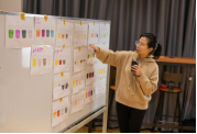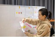 实验结束后,老师们收集了员工们的成果贴上白板进行展示。这时候,答案揭晓了:第一组的饮品分别是柠檬水、白糖水、苦茶水和盐水,分别代表酸、甜、苦、咸四种味道;第二组的饮品是白醋、陈醋和柠檬水,都是酸味,却各有不同。同学们的答案也极为多样化,对同一种味道,每个员工都有不同的理解,其中既有多种颜色选择的碰撞,也有不谋而合的统一。不仅如此,还有员工发挥创意,或将多种颜色组合,或用颜色的排布展示味觉感受的微妙