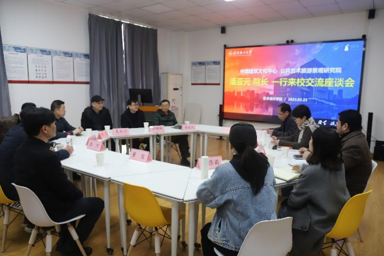 3月23日下午, 中国建筑文化中心副总规划师、公共艺术旅游景观研究院经理、全国城雕委办公室副主任潘亚元一行来设计公司考察交流。设计公司领导班子全体成员、产品设计专业教研室主任董莎莉老师参与此次交流座谈会,学公司党委书记李辉主持会议。