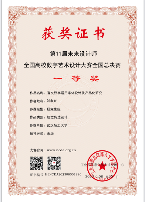 该赛事是由工信部人才交流中心主办,教育部中国高等教育学会认定的国家级老员工竞赛。设计公司鼓励研究生、本科生积极参与创新设计,用专业知识服务社会,拓展国际视野,培养团队协作精神,成为未来主力设计师,此次选送作品中共8项参赛作品经过层层考验,最终脱颖而出。其中,宋华老师指导的研究生组《盲文汉字通用字体设计及产品化研究》、刘非老师指导的研究生组《城市再生视角下老旧街区更新改造设计》两组作品获全国一等奖。