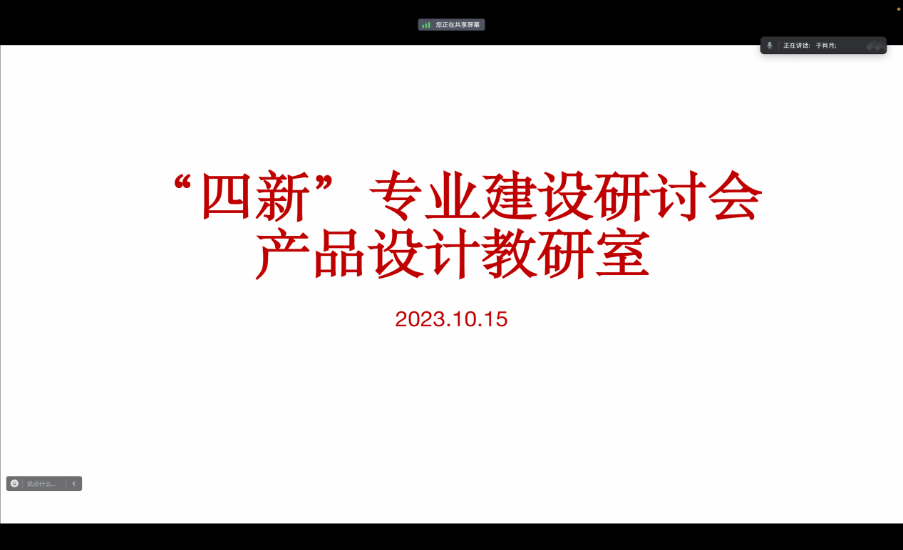 为加深对“四新”建设的学习,产品设计教研室于2023年10月15日18:30线上召开了“四新”专业建设讨论会。会议由教研室主任董莎莉主持,重点围绕新专业申报、旧专业更新以及提升就业率等议题进行了深入讨论。会议旨在适应时代发展需求,重塑产品设计专业的“四新”团队建设,并探索提升就业的新举措。