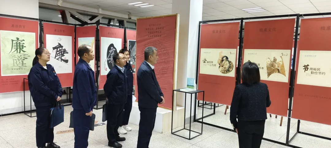 在余艺副书记带领下,李波一行欣赏了“粮廉文化·清廉校园”主题作品展。其中,海报、书法、绘画及剪纸艺术等作品巧妙运用构图、线条、明暗、色彩等造型手法,或以荷花为元素,寓意着清廉正直的品质,或以稻谷、小麦等农作物为主题,表达对农民辛勤劳动的敬意和对粮食的珍视,以及对粮廉文化丰富内涵的理解。通过中华优秀传统粮食文化,引导党员常怀律己之心,把党的纪律要求内化于心、外化于行。