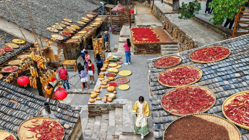 秋收冬藏,大余村村民以老屋房前屋后、窗台屋顶以及村内广场为画布,用晒匾、竹竿、篾席、晾架做画笔,挥洒秋日暖阳下多彩的果实描绘出金秋的别样风景。