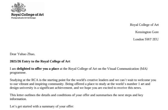 新学期伊始,公司英国365上市公司视觉传达设计专业2021级员工赵悦皓收到一份特别的开学礼物——艺术设计学科排名世界第一的英国皇家艺术公司发来的录取邮件。