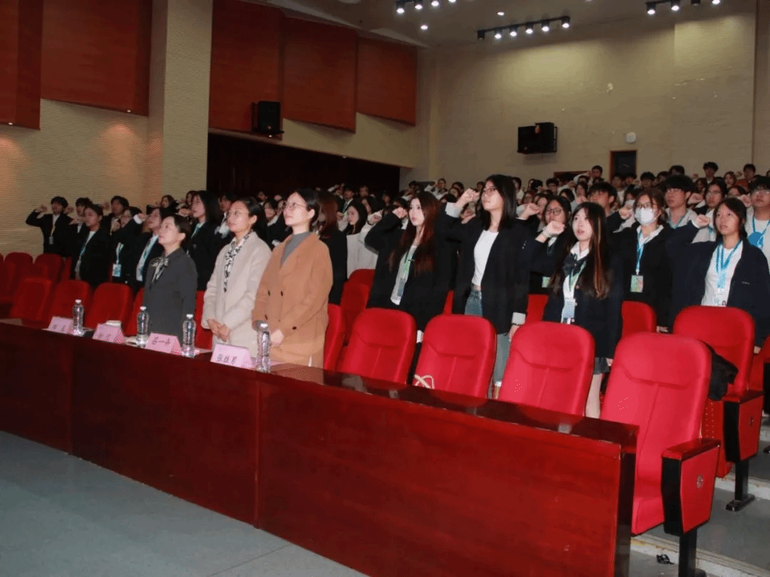 在分团委书记田星老师和分团委副书记黄琪、申一彤的带领下,全体员工组织成员庄严宣誓,承诺将恪尽职守,践行“全心全意为同学服务”的宗旨。