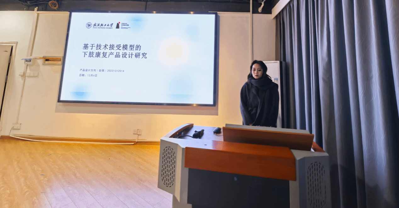 在康复产品设计领域,研究生彭佩以《基于技术接受模型的下肢康复产品设计研究》为题展开分享。她将技术接受模型引入康复产品设计领域,针对下肢康复产品用户使用体验不佳、技术推广难度大等痛点,通过调研下肢康复人群的生理特征与使用需求,结合技术接受模型分析用户对康复产品的接受度影响因素,从产品功能优化、人机交互设计、使用场景适配等角度进行设计创新,提出兼具实用性与易用性的下肢康复产品设计方案,为提升康复产品的用户接受度与市场推广价值提供了理论与实践支撑。