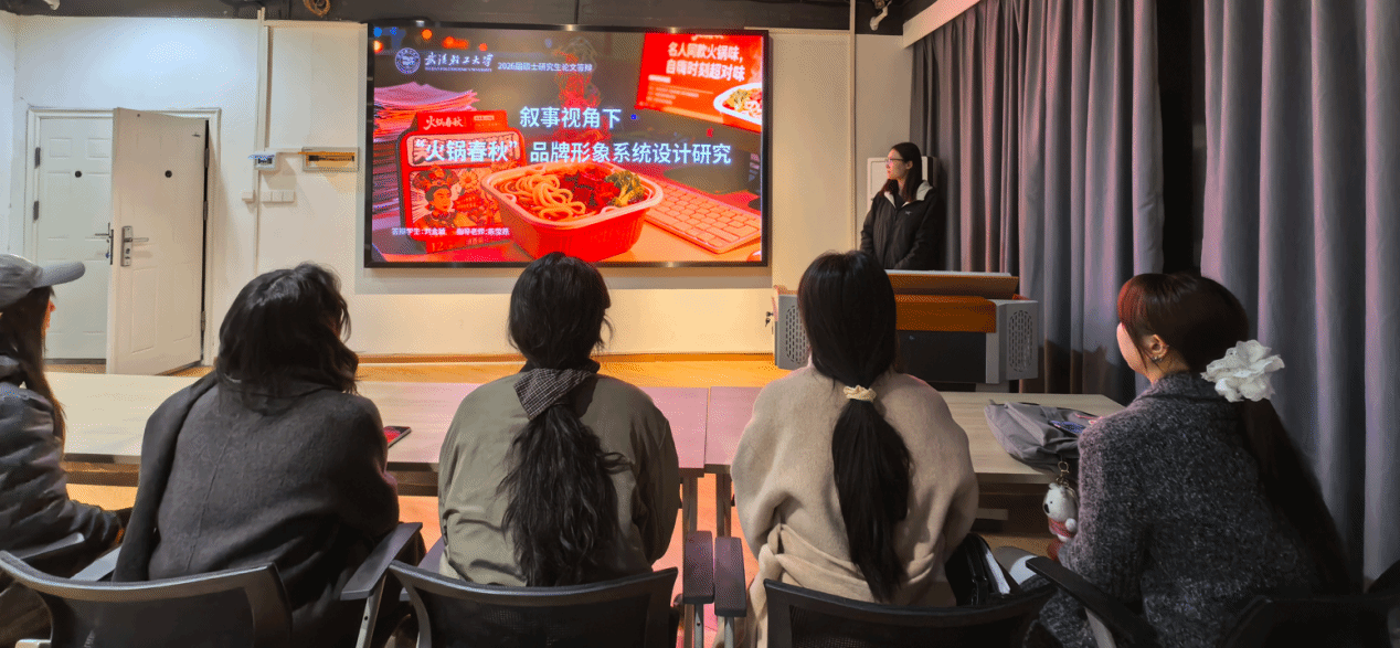 研究生刘金颖的汇报《叙事视角下 “火锅春秋” 品牌形象系统设计研究》,以叙事设计为核心方法开展研究。她深入挖掘火锅文化的历史脉络、地域差异与社交属性,将品牌故事融入视觉形象设计之中,从品牌标识、包装系统、空间视觉等维度构建具有叙事性的品牌形象体系,通过设计语言传递品牌的文化底蕴与情感价值,为餐饮品牌通过形象设计增强文化认同感与市场竞争力提供了新的设计路径。