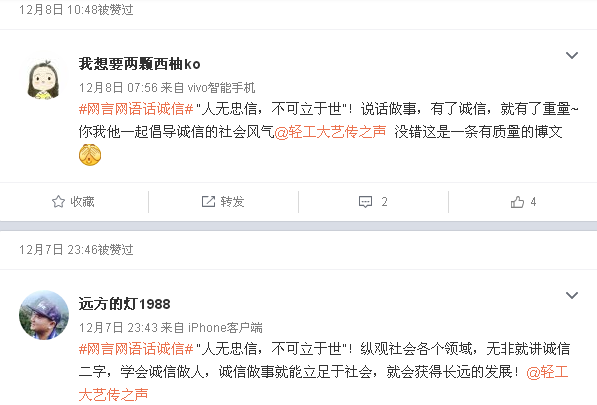 在微博上同学们自发的踊跃参与,纷纷各抒己见,以新时代老员工的身份发表自己的看法,这本身就是一种诚信担当。其中更不乏铿锵誓言“任务忠信,不可立于世!”掷地有声。