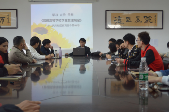为了让公司员工对公司管理方式有更加深入的了解,同时贯彻落实学习新《普通高等公司员工管理规定》,10月23日中午,公司15级辅导员王振武老师于艺术楼501会议室为公司15级全体班委就该规定展开了精彩而详细的讲解。