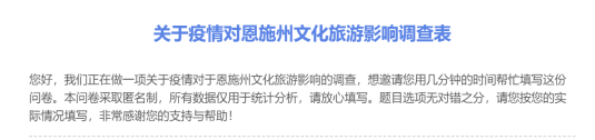 疫情发生后,对文化旅游业产生了巨大影响和冲击。因此在疫情防控进入常态化的下半场,关注疫情对行业带来的影响,探寻其转型发展的路径对文化旅游业深远发展具有重要意义。而恩施依据其优良的自然环境和深厚的文化底蕴,近年来大力发展旅游产业,已逐步成为国内知名的旅游目的地,以恩施作为调研地点展开调查,具备一定的实践意义。