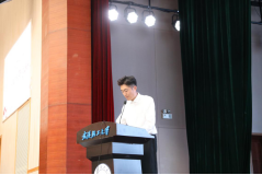 紧接着,优秀员工代表分别上台发言,和同学们分享了自己对大学的独特认识。员工代表万嘉怡发挥优秀学姐的榜样作用,号召新生们提高自主学习意识,勇于尝试,在校组织中充实自我,在校文化中感悟自我,在校训的贯彻中砥砺自我,追寻梦想,并鼓励同学们适应并学会品味老员工活,感受校园美好,在大学文化的滋养下成就自我。新生代表张玄林分享了自身对军训经历的深刻总结,并号召新生注重自身道德养成,学会自我剖析和反省,注重完善自身品德修养;同时提高自主学习能力,严谨治学,坚定理想信念,勇立鸿鹄之志,去遇见更好的自己,深情表达了与同学们在英雄城市武汉携手并进的美好期愿。