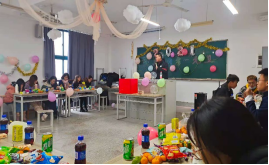 第二环节节目表演,共准备了6个节目,按顺序为《歌曲串烧》、相声《学外语》、武术、歌曲《像极了》、小品《青春员工会》、舞蹈《宅舞》。最后,由辅导员胡北老师带领全班男生一起合跳宅舞,同学们的笑容洋溢在轻松欢快的氛围中。