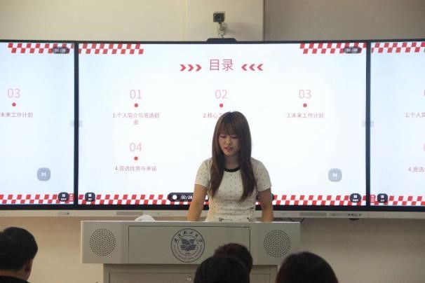 面试环节,候选人依次上台进行展示。他们通过自我介绍、当前工作概况、团队管理、创新措施以及未来工作规划,充分展现出员工干部奉献担当的责任意识与锐意进取的创新精神。面对提问,汇报环节后,田星老师针对相应员工组织的特点和未来发展需求提出问题,候选人从容应答、思路清晰,结合实际工作经验,提出切实可行的解决方案,并一致表示将始终秉持服务初心,以更饱满的热情和更严谨的态度,为全体同学提供更优质、更贴心的服务。