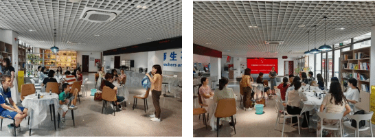 手工扎染导师江小菊向师生详细介绍了 非遗蓝染的历史、扎染原理, 展示示范了蓝染方巾的 制作步骤。企业导师周娟娥结合市场案例,对扎染工艺在服饰设 计、家居装饰、文旅产品等领域的商业化路径进行了解析。现场师生在两位老师的带领下,仔细准备核对物料,开启扎染体验之旅。