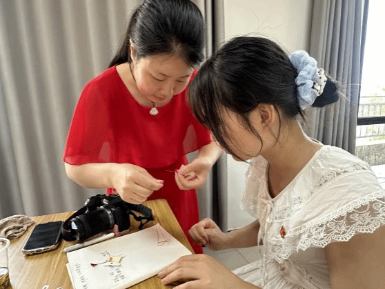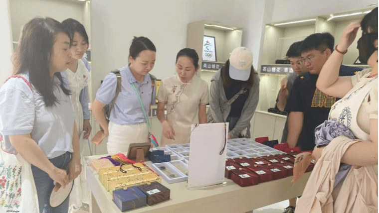 调研过程中,陈广英老师向同学们详细讲述了缠花的历史渊源、技艺流程与创新路径,并现场指导员工体验英山缠花制作技艺。员工们通过亲手缠制花朵、编制头饰,不仅加深了对非遗技艺的理解,也感受到传统文化中“慢工细活”所蕴含的耐心与匠心。团队还围绕缠花在乡村旅游、社区文创、老年手工参与等场景中的融合路径进行了深入探讨。