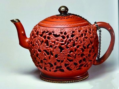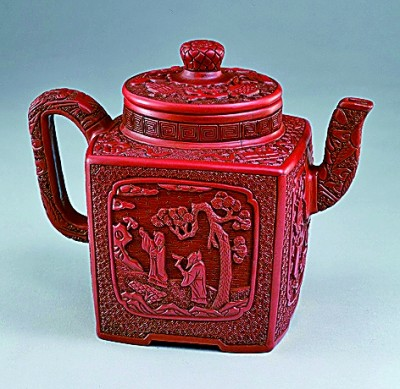 ④明代“宜兴窑紫砂胎剔红山水人物图执壶”