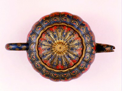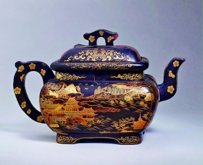 ③清代“宜兴窑紫砂黑漆描金彩绘方壶”