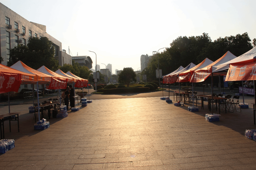 落日余晖温柔洒落,迎新帐篷色彩鲜亮。