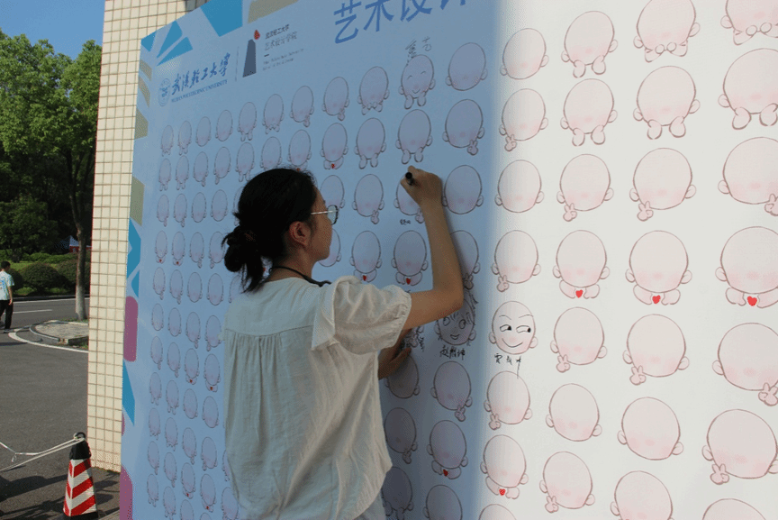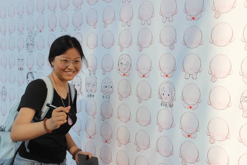 新生签到墙超受欢迎,新生们兴致勃勃画上自己的模样,满是创意与期待。