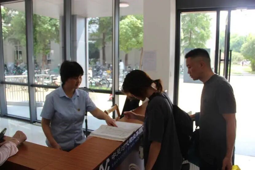 寝室登记处,阿姨穿着整洁的蓝色制服,面带温和笑意,耐心指导新生填写信息。