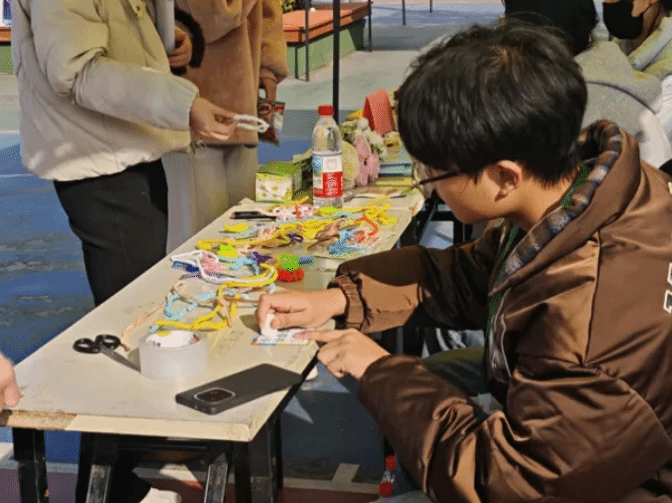 活动现场,亮眼的黄色帐篷下人头攒动,三大主题工坊同步开放,让同学们在实践中沉浸式感受志愿服务的温度。“指尖上的志愿”扭扭棒工坊:同学们将材料塑造成爱心、和平鸽等造型,作品或珍藏展示,部分还附上志愿宣言;“井盖变‘景’盖”微型社区设计工坊:以纸盘为“迷你井盖”,围绕友好、环保主题涂鸦,优秀作品有望落地周边真实井盖;“落叶寄情”自然物拼贴画工坊:用校园落叶、花瓣等材料拼出志愿者身影、友谊树等图案,成品可留作纪念,也能由青协转赠校园守护者。