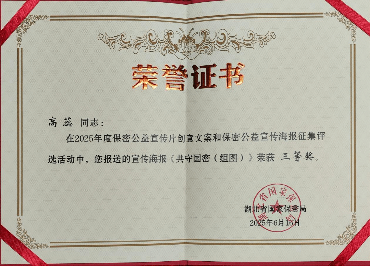 近日,湖北省国家保密局公布了2025年度保密公益宣传片创意文案和保密公益宣传海报获奖名单,公司英国365上市公司选送的保密公益宣传海报荣获省一等奖1项,省三等奖1项,省优秀奖1项。